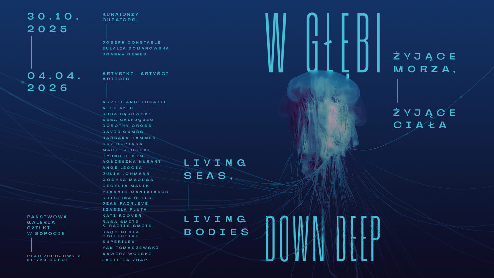 Wystawa „W głębi: Żyjące morza, żyjące ciała / Down Deep: Living seas, living bodies” odbędzie się w Państwowej Galerii Sztuki w Sopocie od 30 października 2025 do 4 kwietnia 2026. Wernisaż zaplanowano na 30 października o godzinie 18:00. Ekspozycja prezentuje międzynarodowe grono artystek i artystów, którzy podejmują temat więzi człowieka z oceanem - jego rolą jako źródła życia, emocji i świadomości. Wydarzeniu towarzyszyć będzie konferencja „Humans and European Marine Environment - adaptation to climate and biodiversity change”, organizowana przez Instytut Oceanologii PAN w Sopocie 6 listopada 2025 roku. Kuratorami wystawy są Joseph Constable, Eulalia Domanowska i Joanna Gemes, a sekcję „Kobiecy obraz morza 2022–2024” przygotowała dr Paulina Pakszys. Projekt powstaje przy wsparciu partnerów krajowych i międzynarodowych oraz dzięki dofinansowaniu Miasta Sopotu i Ministra Kultury i Dziedzictwa Narodowego.